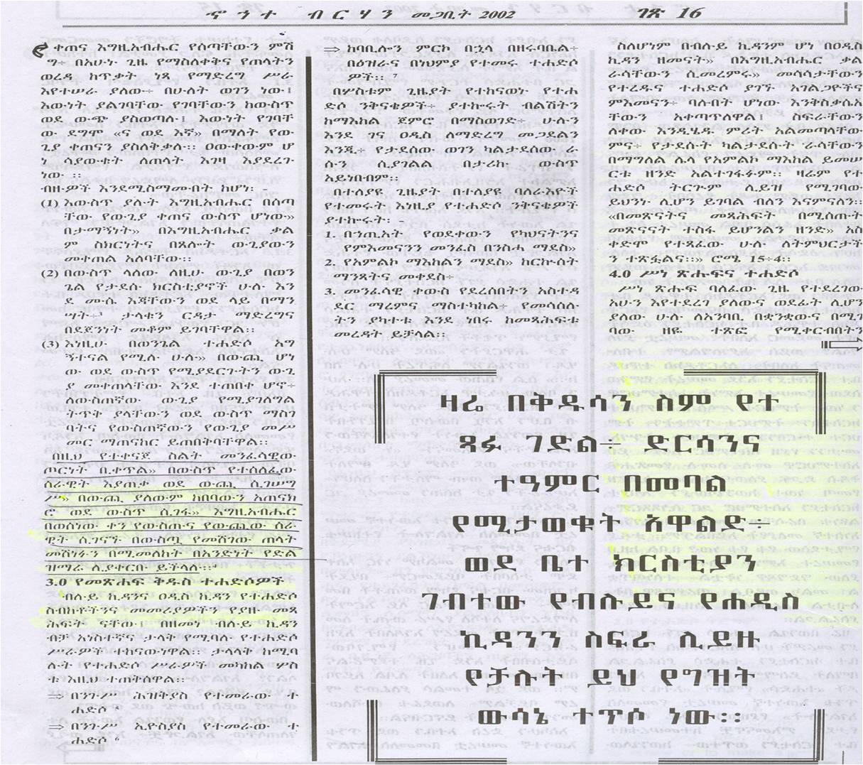 “እንደ እውነቱ ከሆነ በወንጌል እውነት ከታደሱ በኋላ በየጊዜው እየተመዘዙ የወጡት ምእመናኖቿና አገልጋዮቿ በውስጧ ቆይተው የተሐድሶን ሥራ እንዲሠሩ ቢደረግ ኖሮ፣ በወንጌል ተሐድሶ ያገኙ ክርስቲያኖች ለዓመታት የጸለዩበትንና የጓጉለትን የኦርቶዶክስ ተዋሕዶ ቤተ ክርስቲያን ተሐድሶ በቅርብ ጊዜ ሊያዩ ይችሉ እንደ ነበር የሚያምኑ ጥቂቶች አይደሉም፡፡” (ኆኅተ ብርሃን፣ መጋቢት 2002፣ ገጽ 15)
